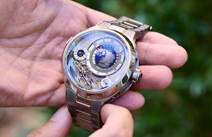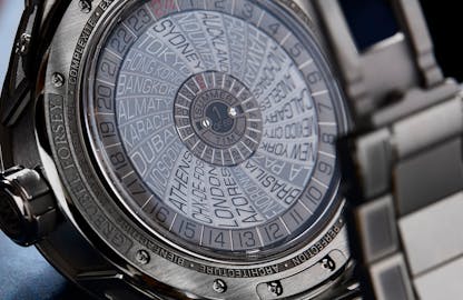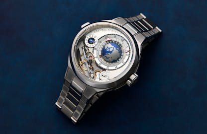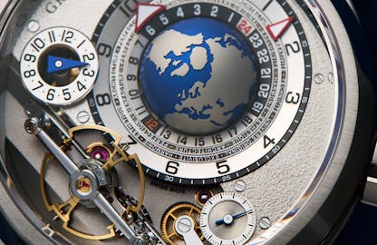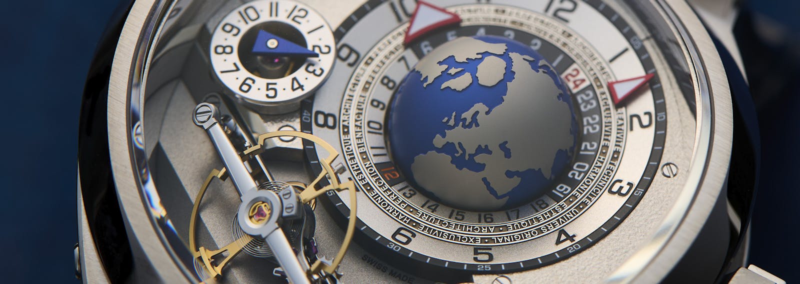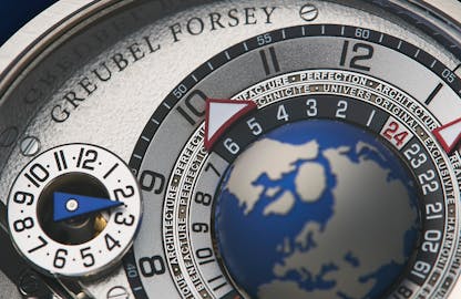 Greubel Forsey would go on to release several variations on its unique take on the GMT complication, including one with a quadruple tourbillon, but in 2022, it released the Balancier Convexe GMT, which it said would replace tourbillon-based versions of the GMT complication moving forward. The Balancier Convexe combines the Balancier concept, launched in 2017, which uses an inclined balance, with the same functionality of earlier GMT watches, and with a very large version of Greubel Forsey’s rotating globe.