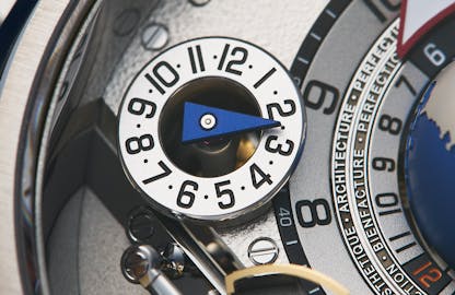 The inclined balance offers the benefits of a tourbillon, but is less complex mechanically, and since there’s no tourbillon cage, the balance can be relatively larger. The inclination of the balance prevents the balance and balance spring from assuming either a completely flat or completely vertical position except very briefly, and since the most extreme positions are avoided, positional errors are reduced. Local time is read off the larger 12 hour subdial that surrounds the rotating Earth; the time in different time zones around the world can be read off the day/night 24 hour disk, and the time in a second time zone can be read off the smaller 12 hour subdial to the right of the Earth display. Running seconds are visible in the subdial at 5:00.