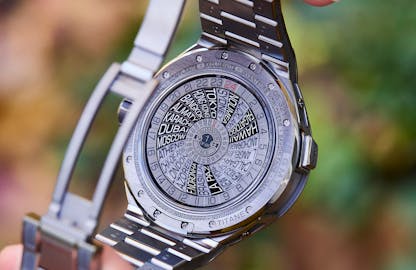 One of Greubel Forsey’s most distinctive complications is the GMT complication, which the company handles in an unusual way. GF introduced the GMT complication in 2011, in a watch with a 24º inclined tourbillon, and with a three dimensional miniature planet Earth which rotates once every 24 hours. The watch has a 12 hour subdial for showing the time in a second time zone, but it also functions as a world timer – the globe is surrounded by a 24 hour ring, and on the back of the watch there is a rotating disk with reference cities, and two 24 hour inner and outer rings; the display is set up so that you can read standard time off the outer ring and Summer/DST off the inner ring, making it one of the few world time watches capable of accounting for local differences in the implementation of DST.