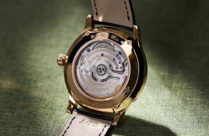 The Master Calendar with moonphase has gone through several different incarnations since the Master Control collection was launched in 1992, and this model was made from roughly the late 1990s up to about 2005. Modern versions of the Master Calendar are larger than this one’s 37mm diameter and also feature a larger diameter moonphase opening, which cuts off the date in the lower quadrant of the dial. The new model gets around this through the use of a jumping date hand, which skips from the 15th to the 16th by jumping over the moonphase disk. Here, however, we have an earlier, more classical execution in which the dates are uniformly spaced around the dial, with the model dating from the early 2000s.