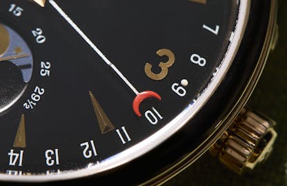 The date hand’s arbor is below the level of the hour and minute hands, and if you look closely, you can see that there’s a definite but unobtrusive step in the hand, which raises the level of the red crescent up above the dial so that it can clear the triangular hour markers. The newer Master Calendar watches dispense with the red crescent and instead, used a miniature version, in red, of the JLC logo, so the red crescent’s a very charming, and out of production, period detail.
