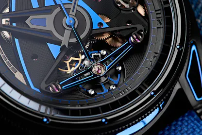 The Swordfish, as we’ve mentioned, is fully ISO 6425 compliant, with a 105 meter water resistant case, a unidirectional timing bezel, and luminous material on the hands and dial. There are also all of De Bethune’s patented horological inventions, including a blued titanium balance with white gold rim weights, De Bethune’s flat balance spring with self-centering, terminal curve affix (this essentially gives you all the advantages of a Breguet/Phillips overcoil without the added height) and the Triple Pare-Chute antishock system, in which the upper balance pivot is under a balance bridge with two additional antishock assemblies at the end of each arm.