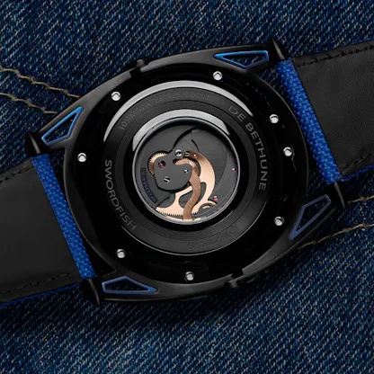 This year, De Bethune is introducing the DB28GS Swordfish, the latest version of the DB28GS and the latest De Bethune watch to feature the internal, mainspring powered dynamo system introduced in the DB28GS Grand Bleu in 2019 and then a year later, in the DB28GS Yellow Submarine, with its heat-tempered titanium case brought up to a golden yellow (an unusual heat temper in watchmaking in general, and I think unheard of outside De Bethune in titanium).