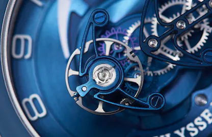 The system requires no lubrication on the impulse surfaces and the impulse force is exactly symmetrical. The first version of this escapement, the Dual Direct, drove the escape wheel directly (like the Breguet natural escapement) but there was a basic design problem – each of the escape wheels had only five teeth on their entire circumference to impulse the balance, which meant each wheel was turning 72 degrees at every balance impulse. This was inherently inefficient and so, the Dual Direct escapement was updated to the Dual Ulysse.