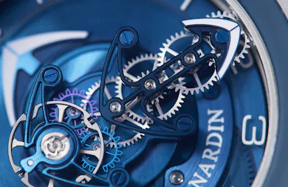At the other end of the gear train, there’s a double wheel escapement – the Dual Ulysse escapement. This escapement is based on Breguet’s so called “natural” escapement, which had two escape wheels as well, both of which drove the balance directly. The Dual Ulysse escapement’s double escape wheels drive a small lever, taking turns impulsing it as it in turn impulses the balance.