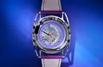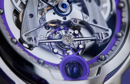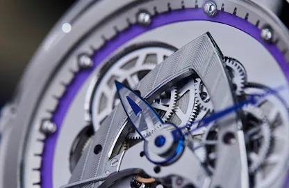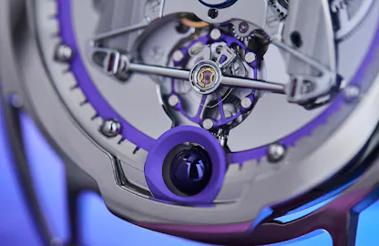 The watch has many if not most of the technical and design features that make a DB watch instantly recognizable. The articulated floating lugs allow the watch to comfortably conform to the wrist and the crown at 12:00 is a shout-out to the pocket watch era of mechanical horology; it’s also necessitated by the overall configuration in the movement, which is rotated 90º to the left in order to bring the apex of the delta-shaped bridge to the 12:00 position. (The delta bridge was first used by De Bethune in its first in-house movement for the DB15 Perpetual Calendar in 2004 with the tip of the delta oriented towards 3:00 on the case, where the crown was located; the crown at 12:00 configuration was first adopted by De Bethune for the DBS, in 2005). The chapter ring and ring around the spherical moonphase display are done in heat colored titanium, tempered to a deep purple.