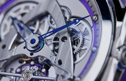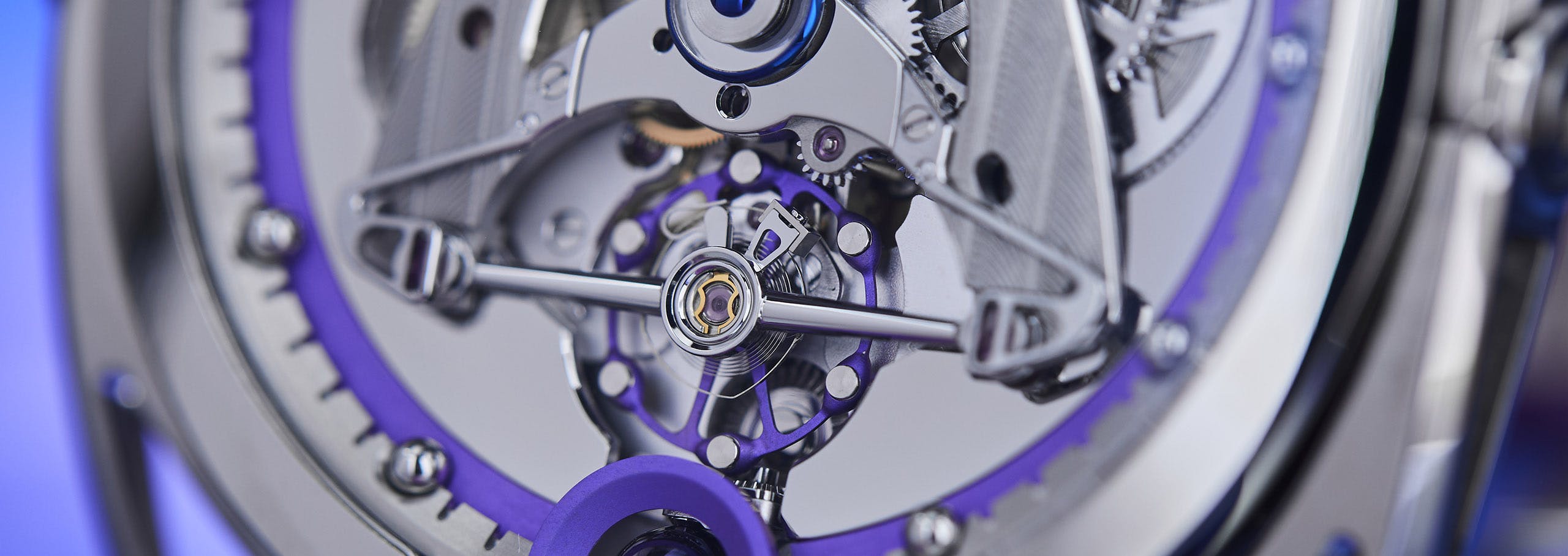 The hands are very elaborate pieces of work – they’re transparent sapphire, to provide an unobstructed view (or as unobstructed a view as possible, consistent with legibility) of the movement itself. The Steel Wheels are the ratchet wheels on the two openworked mainspring barrels, with the mainsprings themselves visible under the covers.