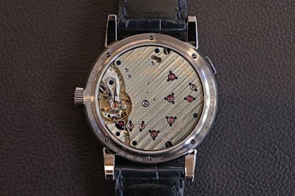 There are several interesting workarounds in the design. Normally, the seconds hand of a watch is fitted onto the pivot of the movement fourth wheel, and in a traditional, non-center seconds watch, the fourth wheel is at 6:00 on the dial side, which is why just about every pocket watch ever made has a small seconds subdial at 6:00. In the Lange I caliber L901.1, however, the fourth wheel’s in the wrong place relative to the seconds subdial, and so Lange used a set of intermediate wheels to get power over to the other side of the movement, and drive the seconds hand. Those intermediate wheels are under the elongated insert in the movement, at 6:00 in the image above. This means that unlike the newer L121.1 caliber, the original L901.1 has an indirectly driven center seconds. All other things being equal, it’s better to have a seconds hand that’s directly driven and one of the big mandates for the Lange design team for the L121.1, was reconfiguring the gear train to support a directly driven center seconds.