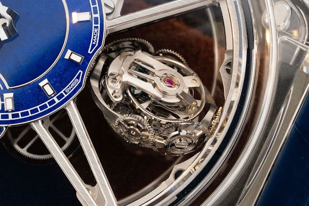 The Zenith Defy Zero G Sapphire, ref. 04.9003.8812/51.R584: case, full transparent sapphire, 46mm, openworked skeletonized movement with lapis lazuili dial. Hands and indexes, rhodium plated, with Super-LumiNova SLN C1. Water resistance 30M. Movement, Zenith El Primero caliber 8812, running at 36,000 vph/5Hz, with Gravity Control gyroscopic module; 50 hour power reserve. Limited edition of 10 pieces in transparent sapphire, and 10 pieces in blue sapphire; price at launch, $207,500. The 1916 Company is proud to be an authorized retailer for Zenith watches; contact us for availability.