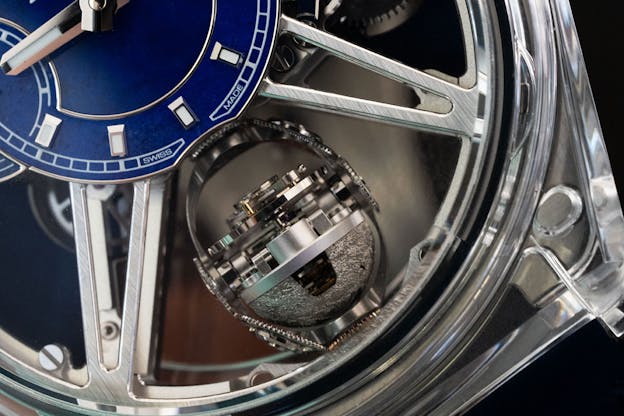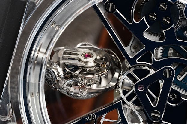 The transparent sapphire model takes full advantage of the very dramatic reduction in size, and increase in general openness, of the new version of the gimbal system, which is now essentially suspended in space at 6:00 – the effect is fascinating and reminiscent of a mystery clock, in that it is far from immediately obvious how energy gets from the mainspring to the escapement and balance. The watch overall is still fairly large, at 46mm, but the reduction in size of the gimbal system means that it’s more wearable (and I would think, less accident prone) than earlier thicker models. The point at which the going train transmits energy to the differential gears surrounding the outer and inner gimbals can be seen from the back of the watch.