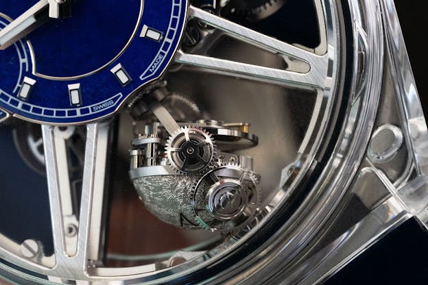 Zenith first debuted its Zero G Gravity Control “gyroscopic module” in 2008, in the Defy Xtreme Zero G. The Gravity Control gyroscopic module consisted of double gimbal system enclosing the escapement, balance, and balance spring, and energy reached the escapement and balance via differential gearing which transmitted torque across the gimbals even while they were in motion. The system was large enough in its first iteration to require a very thick case, as well as a sapphire crystal with a prominent bubble to enclose the gimbals, and Zenith would go on to pair the Gravity Control gimbals with a chain and fusée, in the Christoph Colomb series. (A Christoph Columb Zero G won the Complicated Watch Prize at the 2011 GPHG). In 2018, Zenith released a considerably smaller, second version of the gyroscopic module, which takes up just 30% of the volume of the original, and Zenith has recently announced the latest versions of the Defy Zero G in sapphire cases – blue, or completely clear, in limited editions of 10 pieces each.