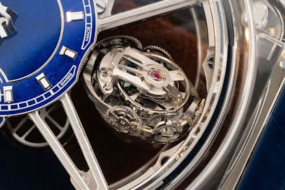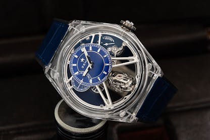 The Zenith Defy Zero G Sapphire, ref. 04.9003.8812/51.R584: case, full transparent sapphire, 46mm, openworked skeletonized movement with lapis lazuili dial. Hands and indexes, rhodium plated, with Super-LumiNova SLN C1. Water resistance 30M. Movement, Zenith El Primero caliber 8812, running at 36,000 vph/5Hz, with Gravity Control gyroscopic module; 50 hour power reserve. Limited edition of 10 pieces in transparent sapphire, and 10 pieces in blue sapphire; price at launch, $207,500. The 1916 Company is proud to be an authorized retailer for Zenith watches; contact us for availability