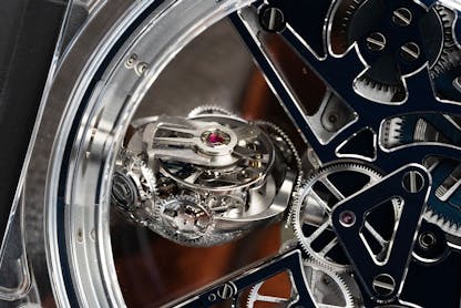 The transparent sapphire model takes full advantage of the very dramatic reduction in size, and increase in general openness, of the new version of the gimbal system, which is now essentially suspended in space at 6:00 – the effect is fascinating and reminiscent of a mystery clock, in that it is far from immediately obvious how energy gets from the mainspring to the escapement and balance. The watch overall is still fairly large, at 46mm, but the reduction in size of the gimbal system means that it’s more wearable (and I would think, less accident prone) than earlier thicker models. The point at which the going train transmits energy to the differential gears surrounding the outer and inner gimbals can be seen from the back of the watch.