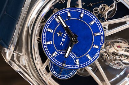 The transparent case gives the watch a spectral presence which is accentuated by the lapis lazuli dial (blue is a signature color for Zenith, along with the star, which together represent the night sky). The lapis lazuli chosen for the dial has minute inclusions of gold-colored pyrite, which add to the night sky effect, and from a design standpoint alone, this is a very well thought out watch. The bridgework is part of the design as well, and not just for its transparency; it’s in the shape of Zenith’s emblematic five pointed star.