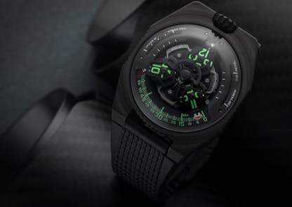 Urwerk is another independent that’s made a name for itself with an unusual complication, found today on the UR-100. Once the minutes hand has passed the sixtieth minute, it disappears and then reappears as an odometer, depicting the 555 kilometres travelled by every person on Earth once every 20 minutes, corresponding to the Earth’s average rotation speed at the Equator. Opposite this, the rotation of the Earth itself around the sun is displayed: 35,740 kilometres every 20 minutes. On the face of the UR-100V, hours and kilometres share the same status, and the same scale – it’s a place where watchmaking and astronomy collide.