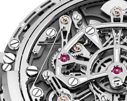 The entire movement has been engineered so that layering of different levels is done away with as much as possible. Ordinarily in a chronograph the chronograph works are an extra layer on top of the movement mainplate and going train; here the going train has been confined to a small region of the mainplate and of course, the automatic winding system (and rotor) are on the same level as well. Most components sit in milled recesses in the mainplate. Even the sapphire crystal construction plays a part; the crystals are flat on top but domed internally, to increase available clearance for things like the hands on the dial side, and the chronograph bridge on the movement side.