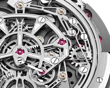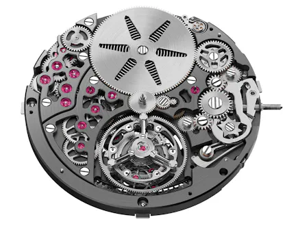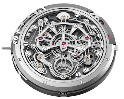 The chronograph seconds wheel is driven by the clutch wheel, which sits under the flat tensioning spring and which is located at about 4:00 in the image. The clutch wheel is driven in turn by the driving wheel on the rear of the tourbillon carriage, with which the clutch wheel is constantly engaged regardless of whether the chronograph is switched on or off.