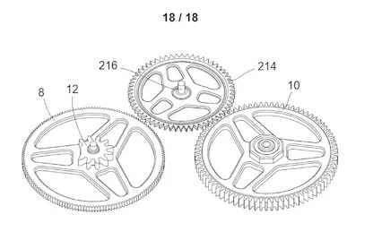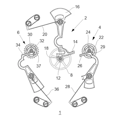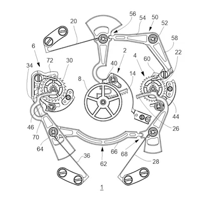 Here the three racks can easily be seen: 26 is the minute rack; 14 is the seconds rack; and 34 is the hour rack (the positions of the racks in the patent filing are slightly different from their final positions in the actual watch but the basic principle is the same). Once the chronograph starts, the wheels begin to turn and the racks begin to pivot on their levers. Once each wheel had made one full rotation, the racks snap back to its starting position under the influence of their springs (36, 28, and 20) and begin pivoting again.