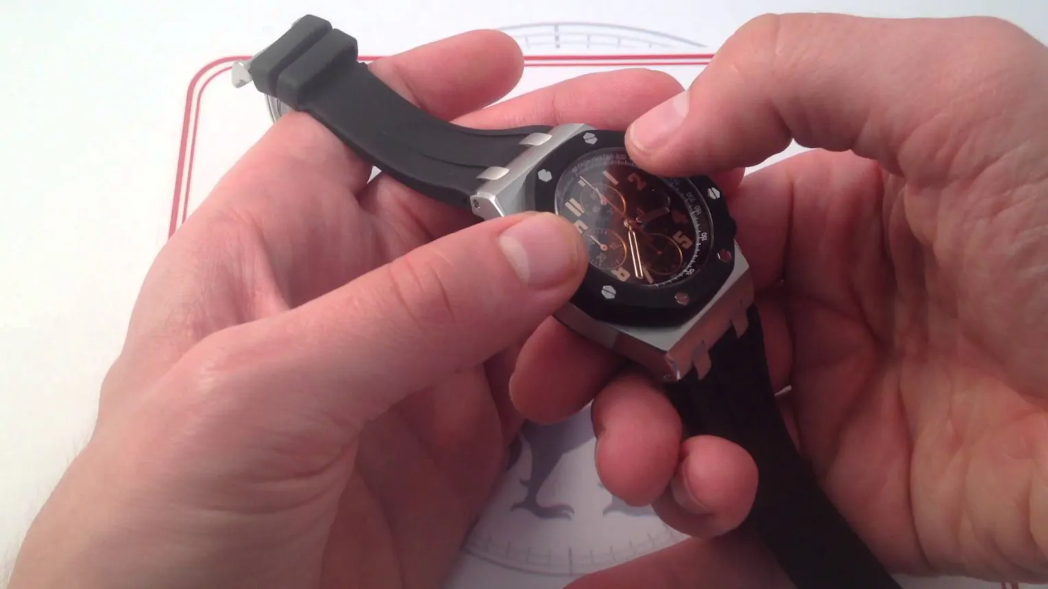 All printing, chapter rings, hands, and the applied “AP” logo are rendered in matching rose gold. The hour and minute hands of the Royal Oak Offshore 57th Street limited edition receive a rare black luminova treatment. This unusual variant of luminescent paint allows the rose gold hands to read as delicate golden outlines superimposed atop the black dial base.