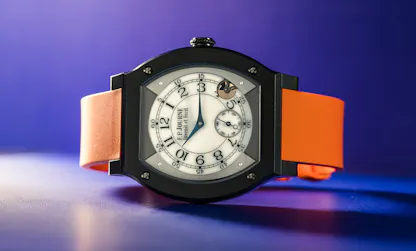 About the watch: Not only does Batman keep Gotham safe, he also protects the new Streamliner Chronograph. The Caped Crusader’s infamous silhouette makes an appearance in the middle of the movement on Moser’s new premier piece.