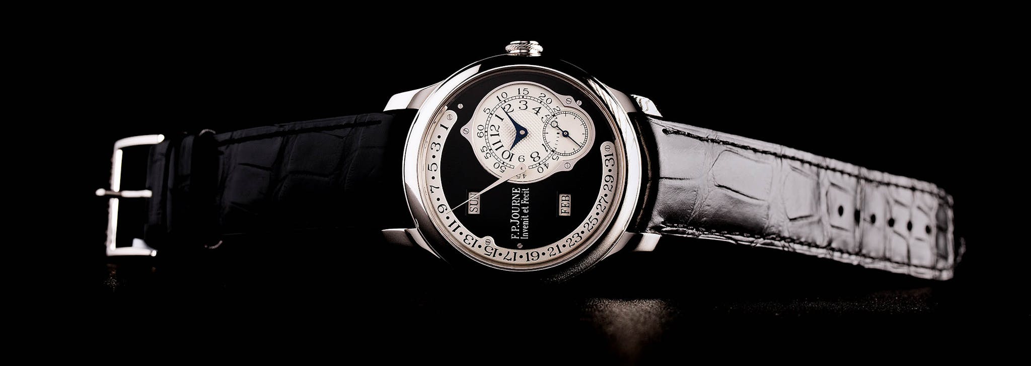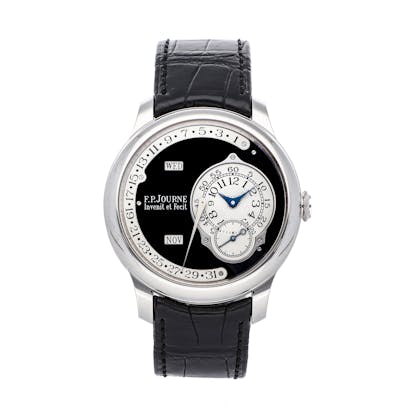 The Black Label F.P. Journe Octa Calendrier is a showstopper. There are other dial colors available for the Octa Calendrier, but the black makes this the perfect dress watch. The layout of the dial has been designed for dress occasions and to be discreetly read when poking out from under a shirt cuff. The model features a retrograde date encompassing the opposite side of the dial. The black and white combination makes this a perfect addition to a tux for formal occasions.