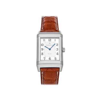 A non-round dress watch option is the Jaeger-LeCoultre Reverso Grande Taille. This model in particular is on a brown leather strap, giving a slightly more casual style, but fortunately, straps can always be changed. When you flip over the Grand Taille, you’ll find the polished caseback. The rectangular dial features contrasting blued hours and minutes hands, and the art-deco horizontal lines make this an understated dress watch.