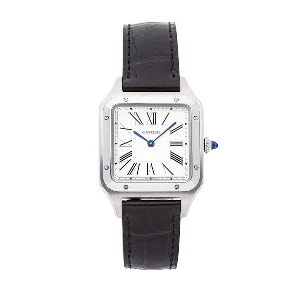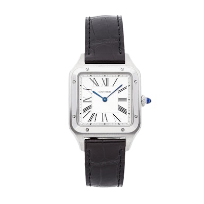 The Cartier Santos Dumont was originally designed for the famed Brazilian pilot, but today the model makes a perfect formal watch. The squared case features a slim profile and Roman numerals showcasing the hours and minutes. Staying true to Cartier style, the watch features a blue cabochon on the crown.