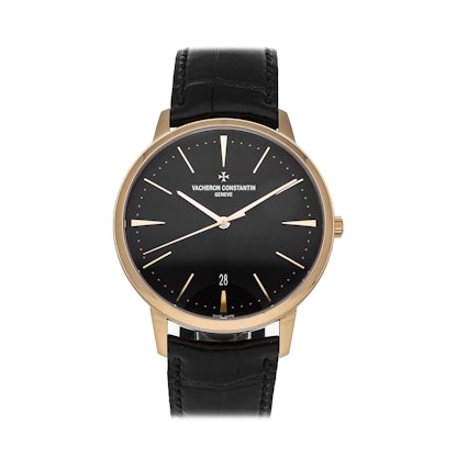 For someone looking for a dress watch in something other than a silver-toned metal, look no further than the Vacheron Constantin Patrimony. The 40mm 18k rose gold case measures only 8.7mm thick and sits on the wrist even lower than it measures. The black dial is complemented with thin rose gold indices. There is a date window but it is also black, making it blend into the dial. If the red gold and black dial are not quite your dress watch style, there are other variations available.