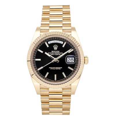The Rolex Day-Date offers many variations of dress models, whether you are looking for a diamond bezel, diamond hour markers, Roman numerals, yellow gold, Everose gold, white gold or platinum, there is something to work for any occasion. The yellow gold and black dial variation is a modern take on a classic dress watch. The model is 40mm and features the iconic President bracelet.