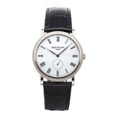 A brand that is known for complicated formal watches, the Patek Philippe Calatrava is a simple time-only model. The 36mm white gold case and stark white lacquered dial are finished with Roman numerals and a black alligator strap. The movement in this thin model is just 2.55mm thick. The hobnail bezel is a nod to the original Calatrava launched in the 1980s.