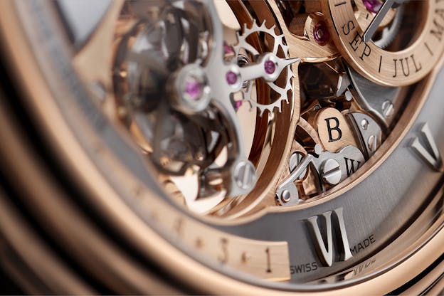 Seen from the front, you can see the four hammers for the striking system, the flying tourbillon, and the indications for the perpetual calendar.