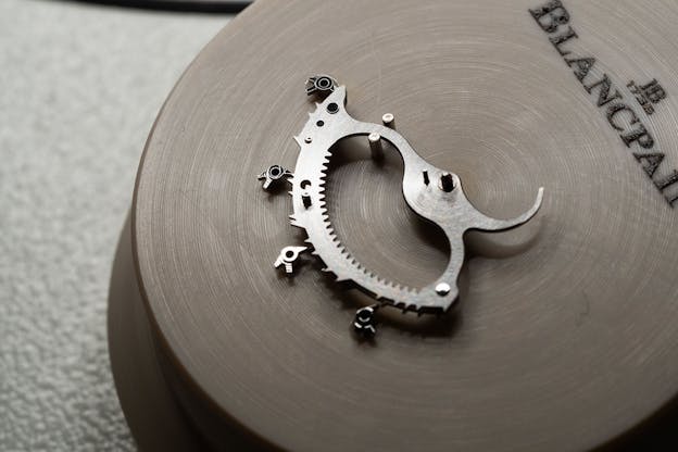 The Westminster Chimes and Blancpain Melody both strike on the quarter hours, and so the tunes are struck by the quarter rack. Since the quarter rack must strike as many as twelve notes (for a full quarter strike at the top of the hour) the rack must have twelve teeth, which are arranged so as to flick the trips, or lifts, of one of the four hammers as the rack passes the teeth. And, since the Grande Double Sonnerie must play either of two distinct melodies, Blancpain designed the quarter rack to have two different levels, superimposed on each other – one for the Westminster Chimes, and one for the Blancpain melody.