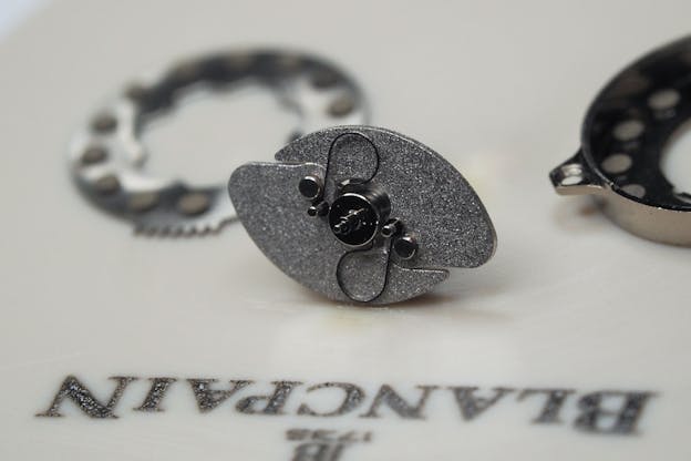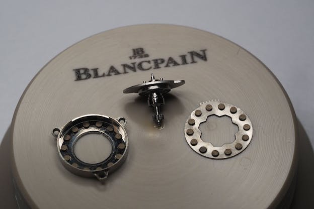 The Blancpain flying tourbillon designed by Calabrese, differs from most other tourbillons in the arrangement of the components inside the cage. Normally, the balance in a tourbillon is co-axial with the axis of the cage, but in Calabrese’s design, the balance is shifted off center.