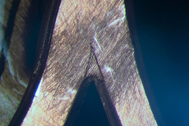 The bridge comes from the machine shop looking nothing like the final result, which gives you an idea just how much work is involved in bringing it to the proper level of finish. Here’s an example, shot from a monitor attached to a microscope being used by an artisan hand-finishing the inner angles, of what one of the inner angles looks like before it’s worked on.
