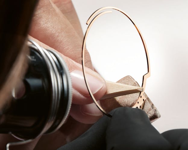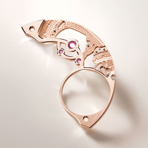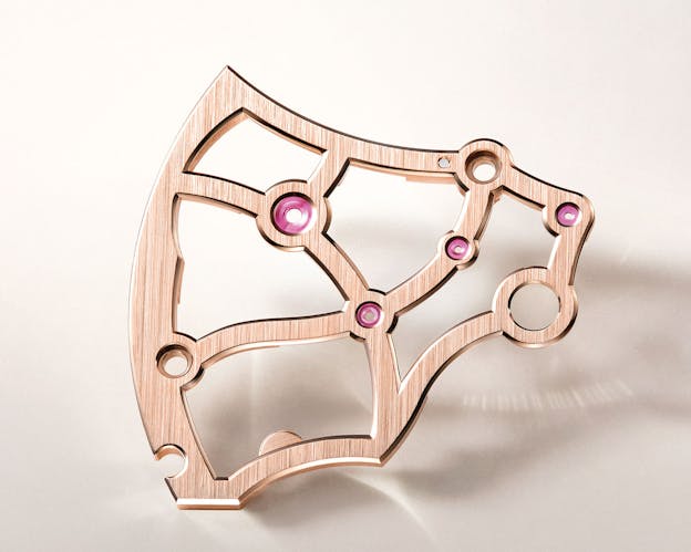 This is the upper bridge for the perpetual calendar works, and it contains a significant number of the total of 135 inward angles found in the Grande Double Sonnerie. The bridge, like the rest of the movement, is made of gold and is initially machined by CNC, before being hand finished. Hand finishing in this case involves finalizing all the interior angles by hand, finishing all the anglage by hand, straight graining the upper surface of the bridge with increasingly fine abrasive paper, and applying perlage to the underside of the bridge.