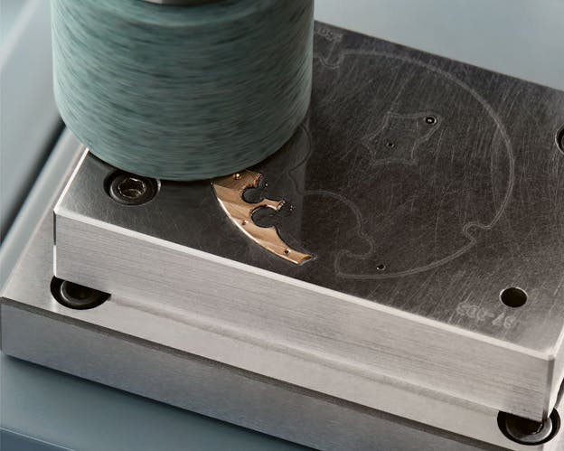 The gongs themselves are gold, and machined using spark erosion, but even after they are delivered, they have to be tuned so that they produce the exact correct notes as well as pleasing secondary harmonics. Tuning of the gongs is checked by means of a laser measuring device, which isolates the primary frequency as well as the associated harmonics. The actual tone is adjusted using the traditional method of filing down the tip of the gong to correct the frequency, which is done in increments of as little as one micron.