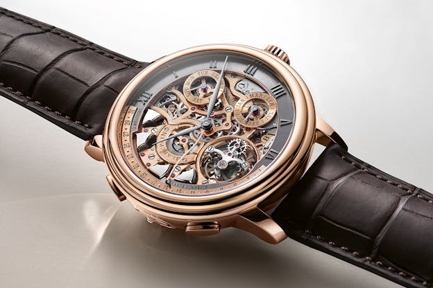 We should preface any discussion of the Grande Double Sonnerie by noting that a grande et petite sonnerie of any kind is a rarity in a wristwatch. The complexity of the mechanism confined it to large chiming pocket watches, so big that they are sometimes called clockwatches, and reducing the complication to wristwatch dimensions didn’t happen until Philippe Dufour produced his grande sonnerie, shown at Baselworld in 1992. Since then they have been made in extremely small numbers and by relatively few brands and individual independents; among the few are Audemars Piguet, Patek Philippe, and F.P. Journe.