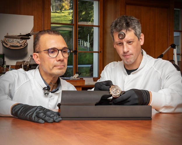 Two watchmakers, Romain and Yoann, are responsible for assembling each watch and the entire process can take nearly a year. In a gesture I hope we see more of in fine watchmaking, each watchmaker “signs” his work – there is a tiny plate attached to the movement with the engraved signature of each watchmaker.