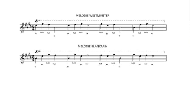 One of the restrictions Singer was faced with when composing the “Melodie Blancpain” was that since it plays on the same gongs as the Westminster Chimes, Singer was restricted to using the same notes – E, G, F, and B, and could only vary their order.