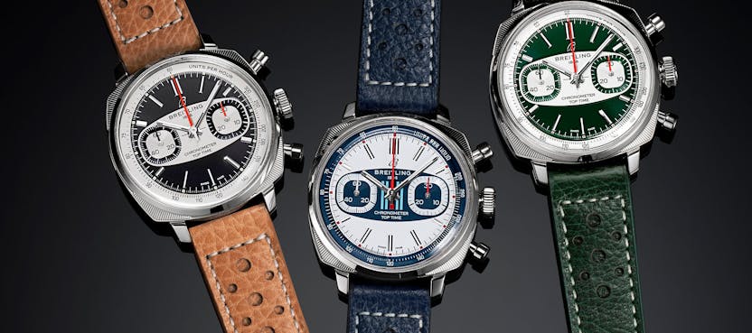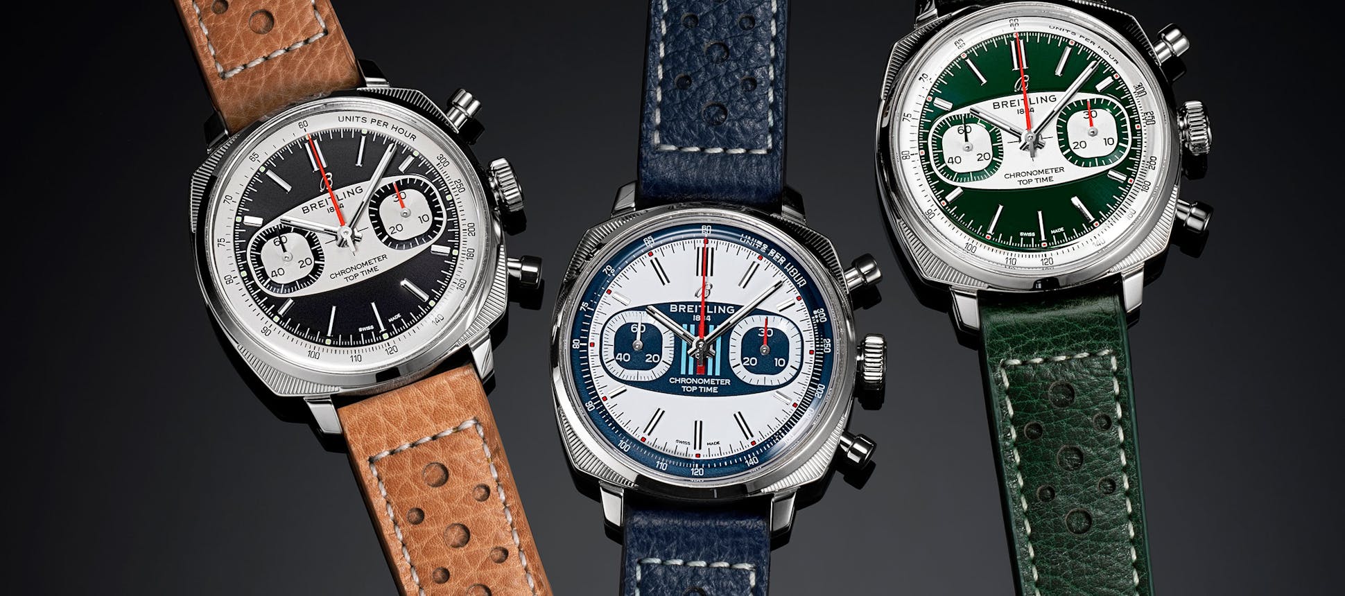 When you think of Breitling, chances are you think of its aviation watches – the Navitimer is most famous, but it’s part of a larger family of technical watches that include the Cosmonaute, Aerospace, and Emergency watches. In the late 1960s and 1970s, though, Breitling also produced a number of chronographs which were an expression of the era’s trend in watch designs towards graphically bold, more design and lifestyle oriented watches. A number of these models had so-called “surfboard” dials, thanks to the ovoid enclosure for the subdials. The watches were often motorsports themed as well, with tachymeter scales and graphic elements connected to car design elements like dashboards and engine grilles. Breitling’s now launching a series of new chronographs that return this now-classic design to its catalog: the Top Time B01 Martini Racing chronographs.