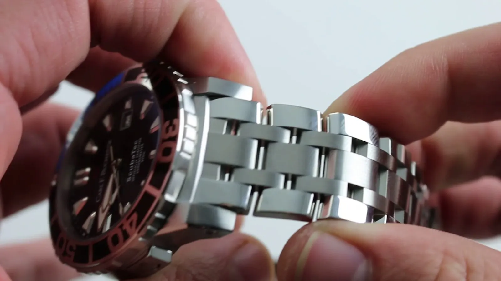 And the five-link bracelet is built with details worthy of a Rolex rival. Each of the links is carefully finished with alternating brushed and polished facets, and the assembled mass never pulls hair or pinches skin. More than a supple companion, the Patravi ScubaTec bracelet features a stellar clasp with the solidity of granite.