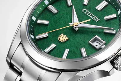 The dial is made of “tosa washi” – Japanese tosa paper, which is considered one of the highest grades of handmade paper from Japan; it’s produced from mulberry pulp, in small quantities, along the banks of the Niyodo River. The paper is famous for its thinness as well as its strength, and for the 50th Anniversary model, Citizen has worked with expert dyers to create a color known as “chitose midori” – literally, “thousand-year green.” The green color represents the needles of pine trees, which in Japan are symbols of unchanging beauty and longevity (an especially appropriate color choice for a wristwatch) and the color is produced by combining a yellow pigment derived from the “ibuki kariyasu” grass, which has been used as a paper and fabric dye in Japan for centuries, with indigo, to produce the final color.