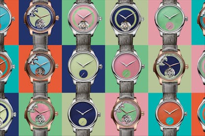 With lapis lazuli, turquoise, coral, Burmese jade, pink opal, and lemon chrysoprase on offer, the choices are widespread, and when combined with Moser’s beautifully finished in-house movements and steel and precious-metal case designs, these watches positively jump off the wrist. The only trouble? Once you’ve tried one on, you’ll invariably want all of them.