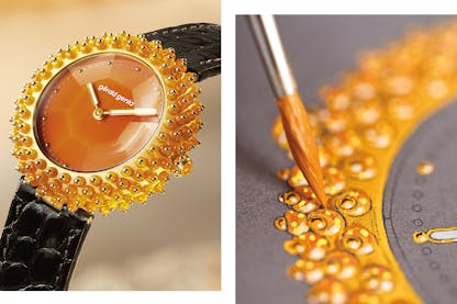While on a trip to Corsica in the 1990s, famed watch designer Gérald Genta found horological inspiration in the shape of a sea urchin. Genta’s eponymous brand began reimagining this unique design through several stunning creations beginning in 2024, but 2025’s iteration elevates the Oursin — French for “sea urchin” — to new heights: The fresh version, housed in a 36mm 3N yellow gold case in a glass-blasted finish, features 137 fire opals, each of which is individually secured via the use of a yellow gold pin. Paired with an orange cornelian dial, the exquisitely creative look is like nothing else on the market.