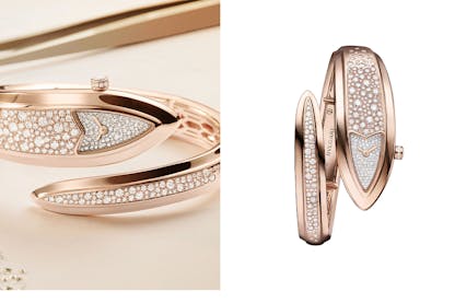 Though diamonds and other precious stones may not provide the visual differentiation of stone dials, these naturally occurring materials nevertheless offer beauty, rarity, and a pop of color to the otherwise more restrained look of an all-metal watch case or dial. Several new Bulgari Serpenti Aeterna references in rose and white gold offer an inspired riff on the maison’s sumptuous Serpenti Tubogas through the combination of precious metals and an abundance of diamonds in different sizes: While the former offers snow-set stones, the latter features diamonds in pavé setting along the case, bracelet, and bezel; both, meanwhile, feature an incredible snow-set dial.