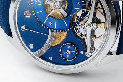 The Greubel Forsey Balancier Contemporain in stainless steel: case, steel, 39.60mm x 12.25mm, water resistance 30 meters; sapphire crystals front and back. Dial, multi-level in gold with sunburst blue finished hour ring, minute circle with blue finish, engraved and white lacquer finished, hand-lapped; hours, minutes, small seconds and power reserve hands in polished steel with hand-polished countersinks.