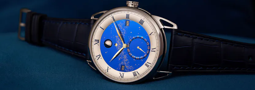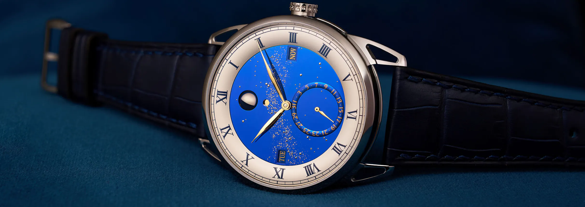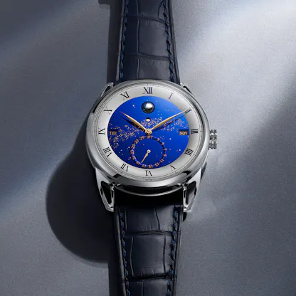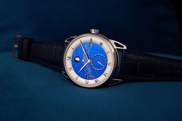 The dial is De Bethune’s signature blued titanium, with stars made of white gold pins, and the Milky Way depicted with micro-laser engraving and white gold leaf. The movement is the De Bethune caliber DB2005 V3, which is 30mm in diameter – the classic diameter for a wristwatch movement – and which has a five day power reserve, with De Bethune’s titanium balance with white gold inserts, the De Bethune flat balance spring (which offers the same benefits as a Breguet overcoil, but without the added height) a silicon escape wheel; the Triple Pare-Chute antishock system, and De Bethune’s spherical moonphase, which is accurate to one day’s error in 122 years.