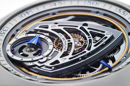 When the case is rotated, the crown shifts into the 12:00 position and the complexity of the watch becomes more clearly visible. The hours are displayed in a sub-dial at 6:00, and the minutes are shown via a peripheral indicator sweeping around an outer chapter ring. Most of the Contemporary side, however, is taken up by displaying the movement, which is De Bethune caliber 2517, running at a high frequency of 36,000 vph. Despite the Contemporary monicker, there is a good amount of classic watchmaking on view courtesy the hand-snailed mainspring barrel covers, and polished and chamfered steelwork. De Bethune’s usual technical innovations are on display as well, including the De Bethune balance and balance spring, and the deadbeat/Jumping Seconds complication, the gearing and separate escapement for which take up the center of the movement.