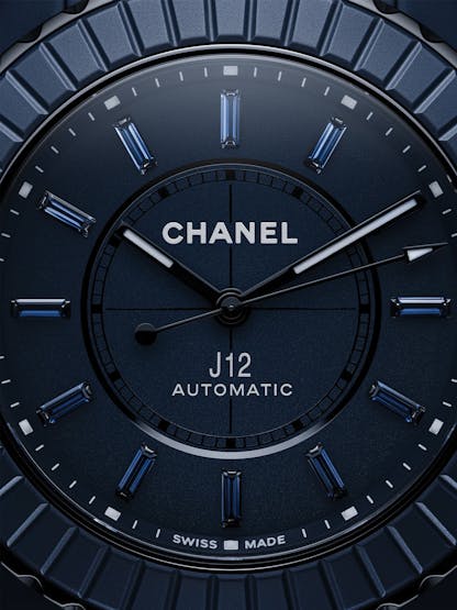 This year, to celebrate the J12’s 25th anniversary, Chanel added its first new color in more than 20 years: matte blue ceramic. This unique hue is exclusive to Chanel, another way of setting its watches apart. Its researchers spent five years creating this scratchproof, durable material. It’s not just any blue; it’s a liminal shade, like the inky blackness of deep water. “I wanted a blue that has a rigorous elegance, a blue that is nearly black or a black that is nearly blue,” says Arnaud Chastaingt, Director of Chanel Watchmaking Design Studio. There are nine J12 Bleu in the collection, ranging from sportier time-only models to jewelry watches set with blue sapphires.