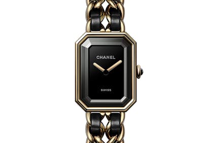 The eye first goes to the unique octagonal case, which mirrors the shape of the stopper of a Chanel No. 5 bottle, down to the beveled crystal. This octagonal shape is inspired by the aerial view of Place Vendôme in Paris, one of the city’s most beautiful and luxurious plazas. Madame Chanel lived at The Ritz on the Place, and designed the stopper after her beloved home. The bracelet is reminiscent of the brand’s handbag chains; the double chain bracelet has ribbons of black leather woven through golden chains. The sleek black dial is devoid of numerals and indices, with just golden hands for the minutes and hours, the Chanel logo, and a discreet Swiss at 6 o’clock. The watch has a strict color palette of black and gold, which are the two hues most closely associated with the maison.
